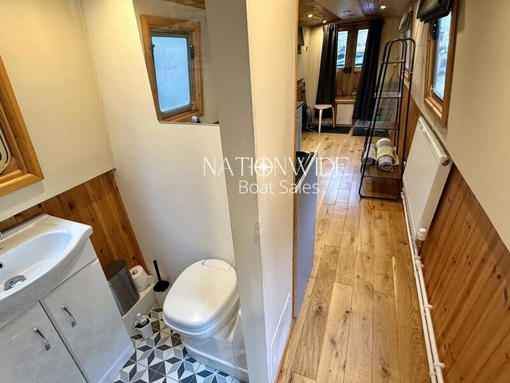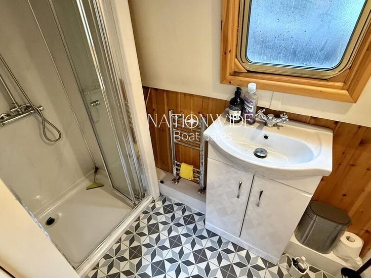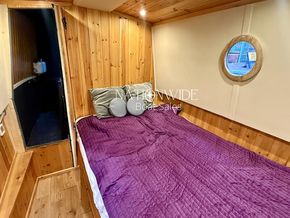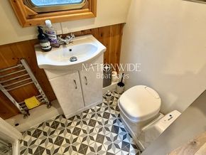 Inside, the cabin feels light and spacious, featuring laminate flooring, ply-lined cabin sides, double-glazed windows, and polystyrene insulation. Heating is provided by Webasto central heating alongside a solid fuel stove, with hot water supplied via calorifier, immersion and Webasto, making her comfortable year-round.